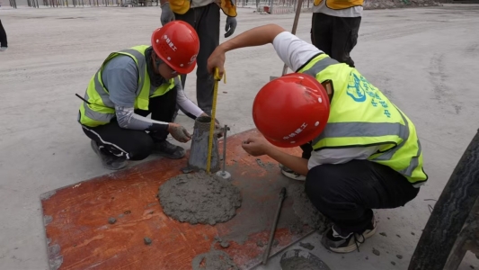 大体积混凝土在高温环境下接连浇筑,易发生入模温度过高、初凝时刻短、水化升温快的危险,项目联动大体积混凝土专家、外加剂专家、水泥厂家,选用骨料预冷+冰水混合拌和的“冷漠”工艺,完结出机温度26℃、入模温度29℃的精准操控;优化合作比,将单位水泥用量由职业惯例260kg/m³降至220kg/m³,同步完结缓凝剂精密调整,使初凝时刻安稳操控在8小时±0.5小时规模内,躲避混凝土冷缝。